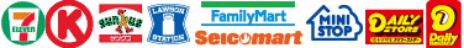 セブンイレブン、サークルK、サンクス、ローソン、ファミリーマート、セイコーマート、ミニストップ、デイリーヤマザキ、デイリーストアヤマザキ